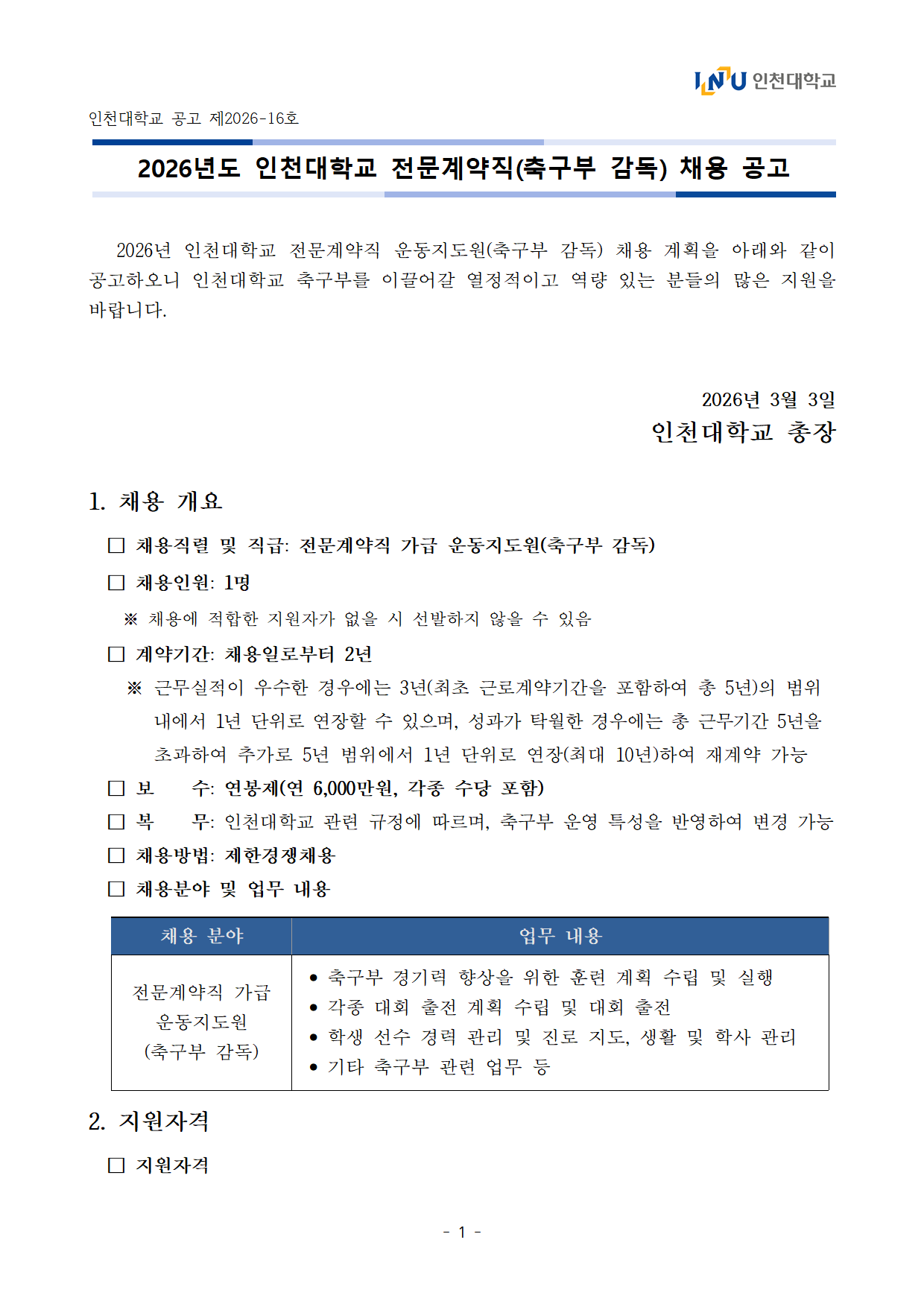 [붙임1] 인천대학교 전문계약직(축구부 감독) 채용 공고문(안)_(2026.03.03.).hwp
