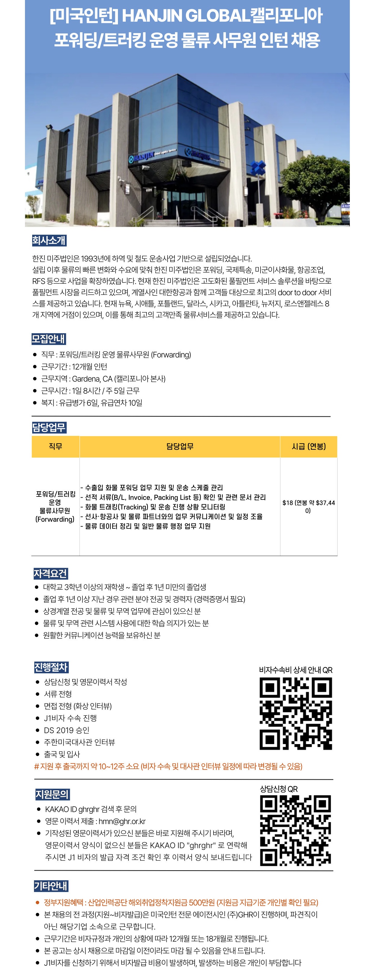 [HANJIN GLOBAL] (해외취업/미국) 캘리포니아 포워딩트러킹 운영 물류 사무원 인턴 채용 (GHR)