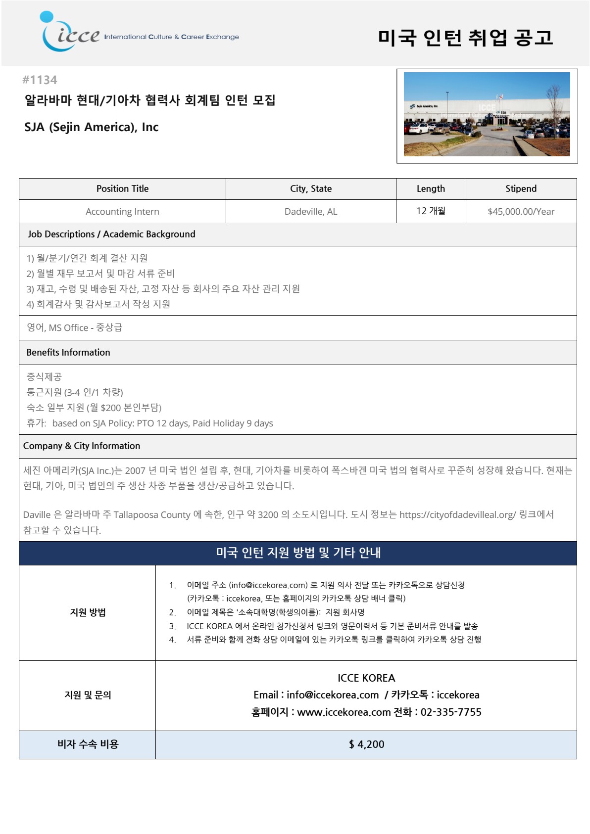 [SJA (Sejin America), Inc] (해외취업/미국) 현대/기아차 협력사 회계팀 인턴 모집 (ICCE)