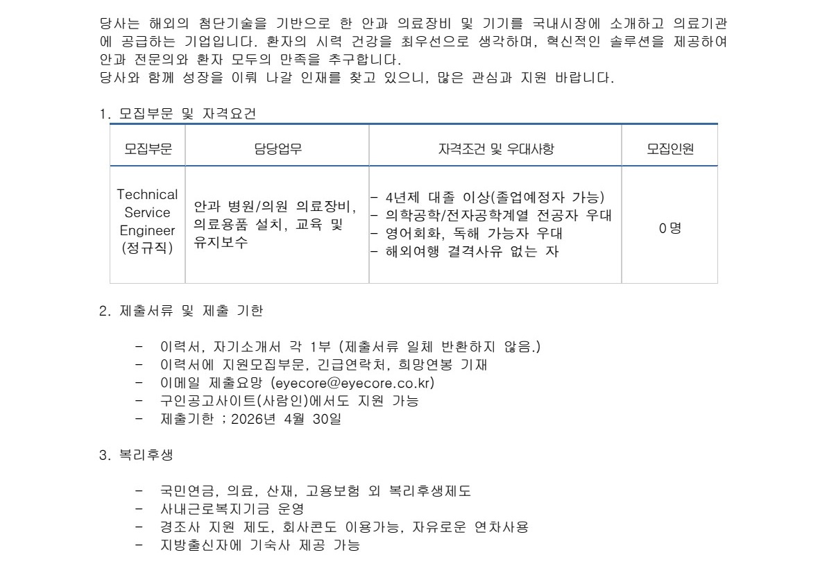 [(주)아이코어] 의료기기 Technical Service Engineer 인재 채용