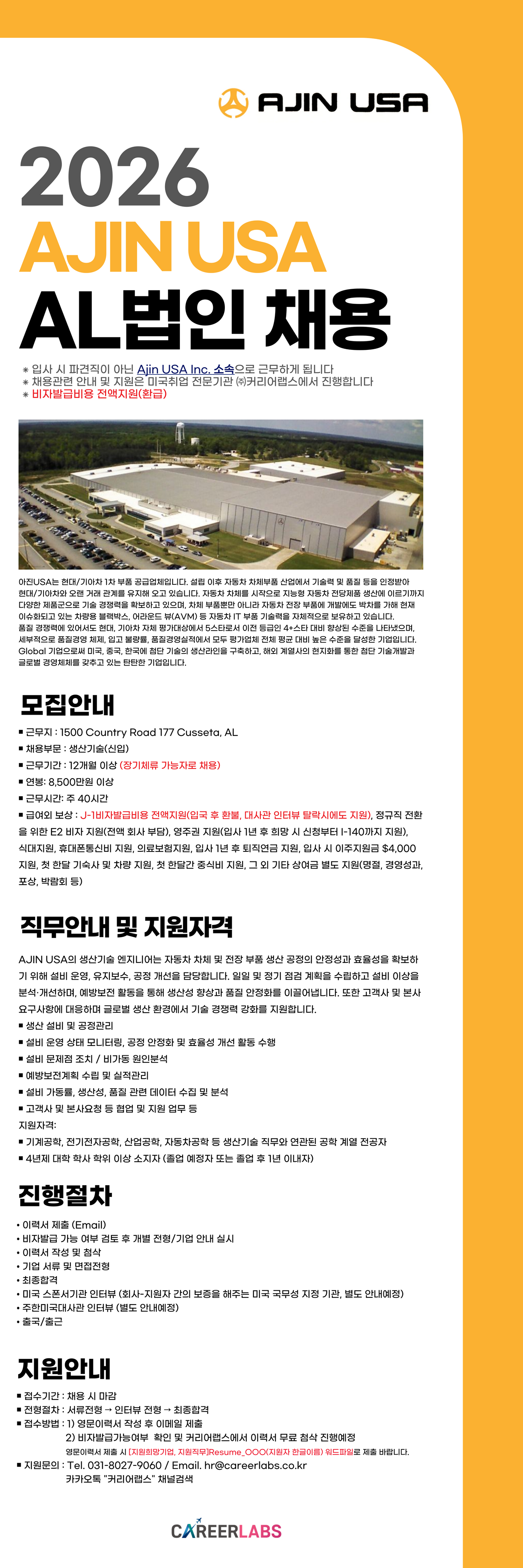 [AJIN USA] (해외취업/미국) 생산기술 부문 채용공고