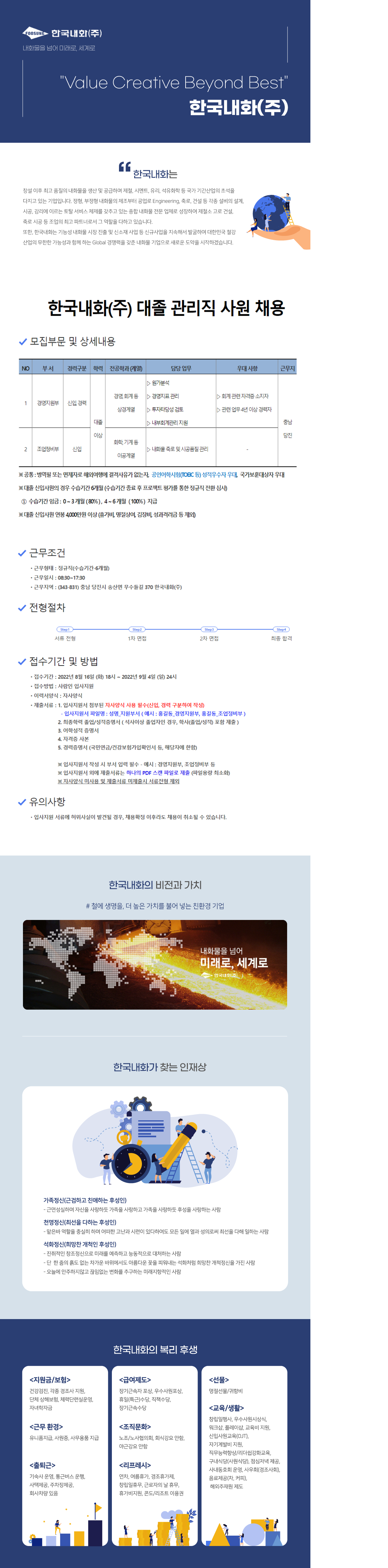 [한국내화] 경영지원부, 조업정비부 채용 공고