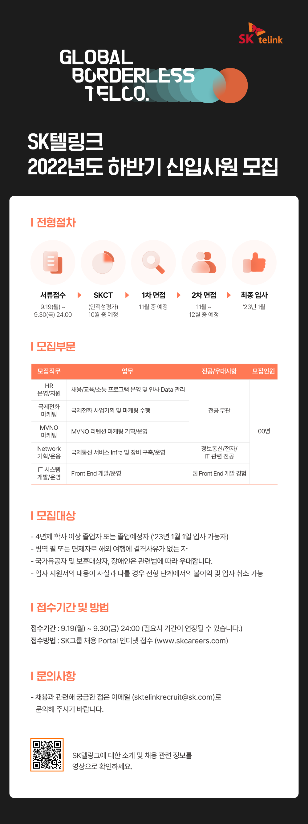 ð GLOBAL BORDERLESS TELCO. ð SK텔링크의 성장을 함께할 신입사원을 모집합니다. ✅ 지원기간 9. 19(월) ~ 9. 30(금) 24시까지 ✅ 모집대상 - 4년제 학사 이상 졸업자 또는 졸업 예정자 (’23년 1월 1일 입사 가능자) - 병역 필 또는 면제자로 해외 여행에 결격사유가 없는 자 - 국가유공자 및 보훈대상자, 장애인은 관련법에 따라 우대합니다 ✅ 모집부문 HR 운영/지원, 국제전화 마케팅, MVNO 마케팅, Network 기획/운용, IT시스템 개발/운영 ✅ 전형절차 서류접수 ▷ SKCT ▷ 1차 면접 ▷ 2차 면접 ▷최종입사 ❤️ SK텔링크 채용 영상 보러가기 ❤️