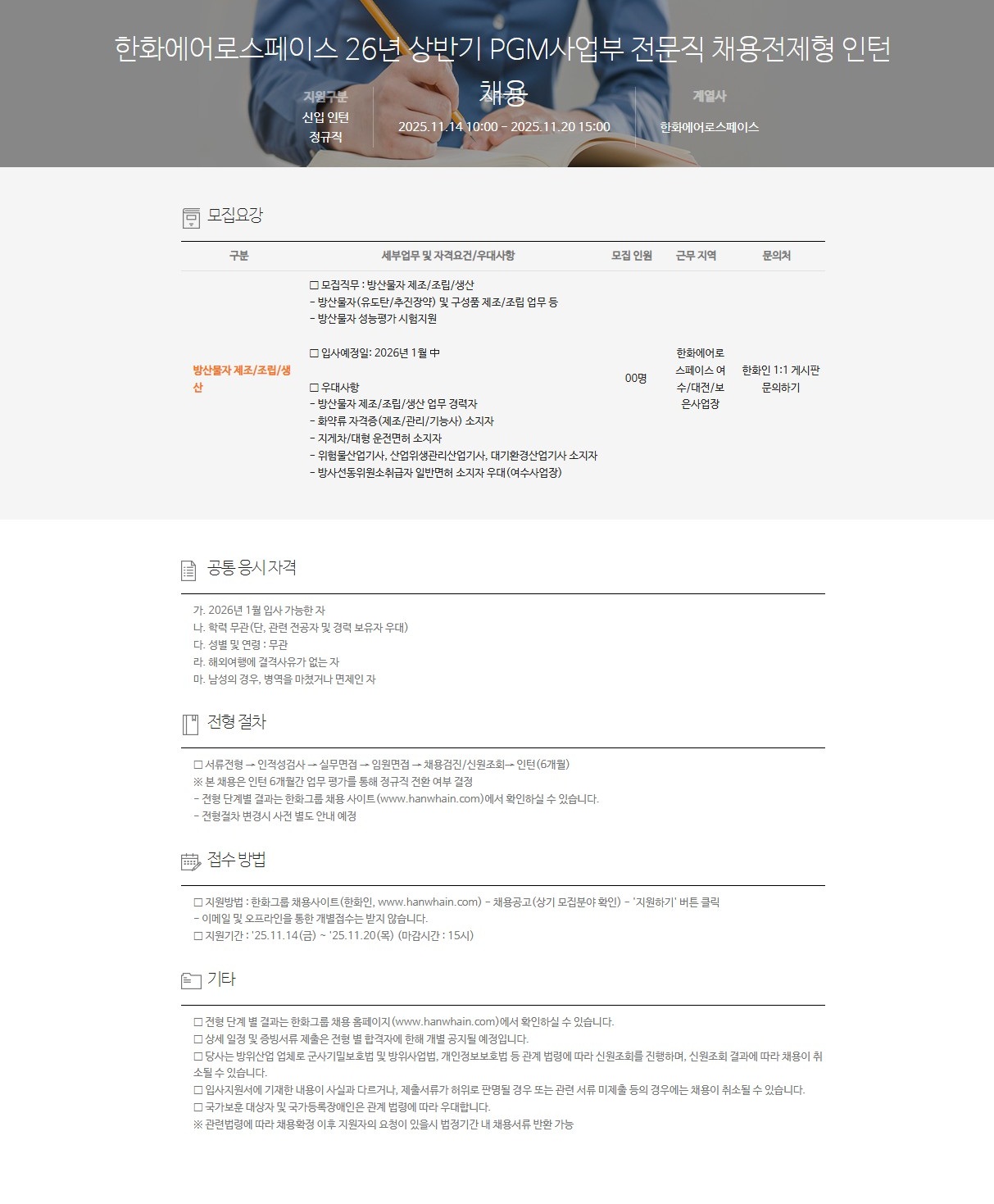 [한화에어로스페이스] 26년 상반기 PGM사업부 전문직 채용전제형 인턴 채용