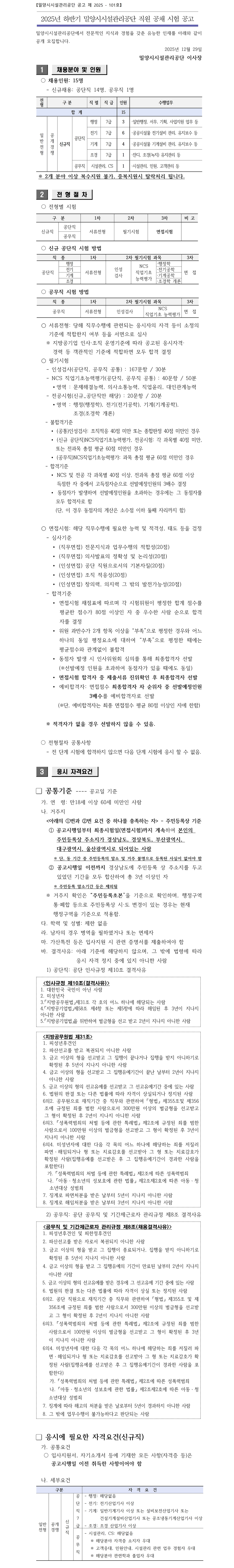 [밀양시시설관리공단] 2025년 하반기 직원 공채 시험 공고