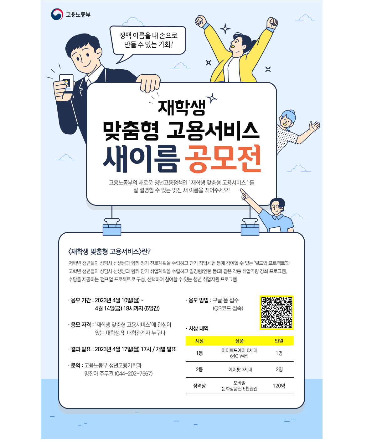 '재학생 맞춤형 고용서비스 새이름 공모전' 결과 발표 일시가 2023.4.17.(월) 17시에서 2023.4.18.(화) 18시로 변경되었습니다.
