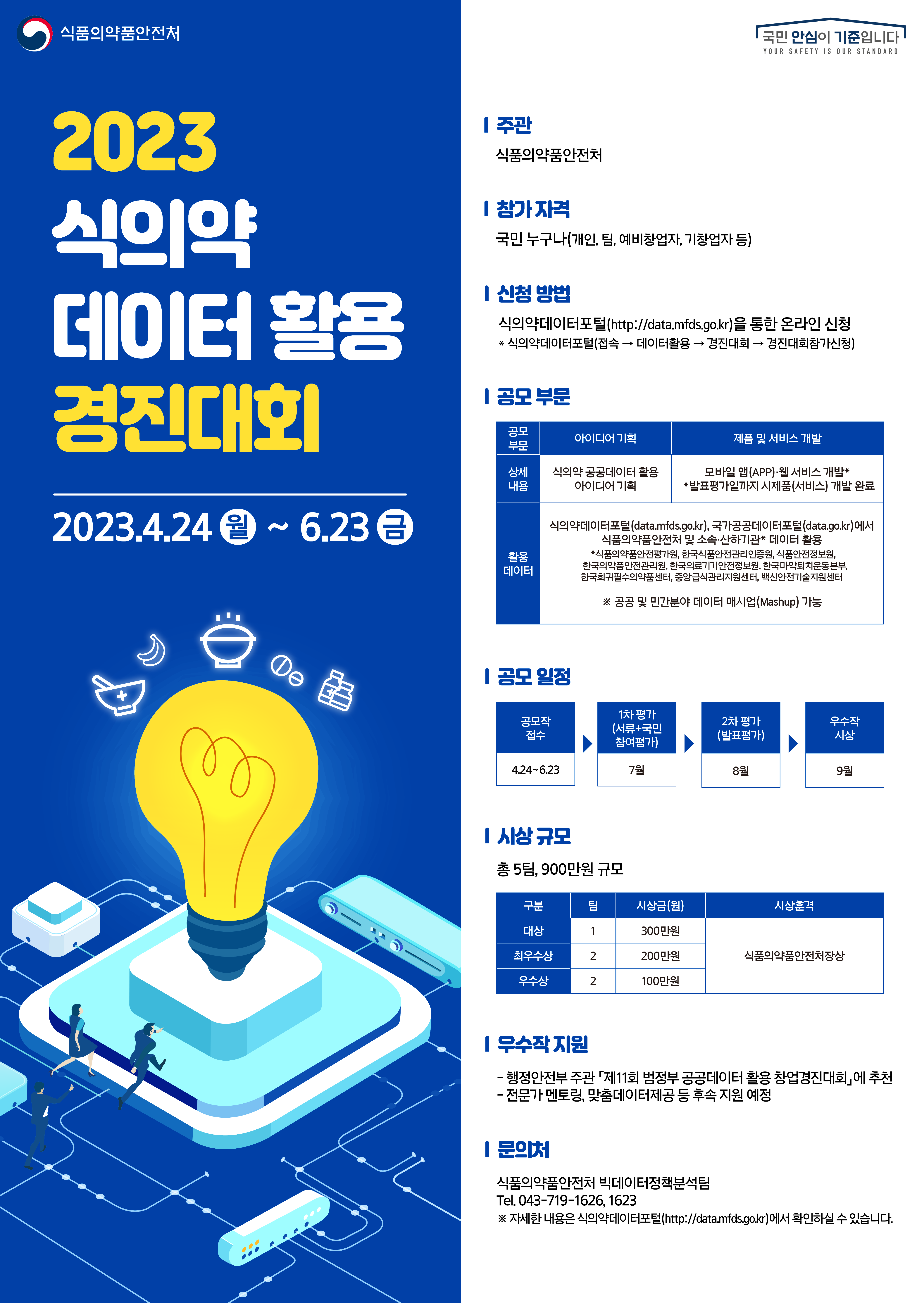 식품의약품안전처에서는 식의약 공공데이터를 활용한 창의적 아이디어를 발굴하고 국민 실생활에 도움이 되는 서비스 개발 및 창업 촉진 지원을 위해 「2023년 식의약 데이터 활용 경진대회」를 아래와 같이 개최하고 있습니다.