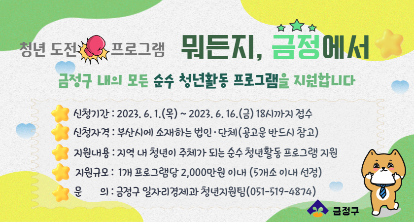 금정구에서는 청년이 주체가 되는 순수 청년 프로그램 활동 지원으로 청년의 사회참여 및 역량강화와 청년 유동인구 활력 증대를 위하여 프로그램 운영기관(보조사업자)을 다음과 같이 모집합니다.○ 신청기간 : 2023. 6. 1.(목) ~ 2023. 6. 16.(금) 18시까지○ 신청자격 : 부산시에 소재하는 법인 또는 단체○ 지원내용 : 지역 내 청년이 주체가 되는 순수 청년활동 프로그램 지원- 청년이 생산·소비 주체가 되는 다양한 청년활동 프로그램 지원- 금정구만의 지역특색 또는 자원을 연계하고, 지역 내에서 활동하는 모든 청년활동 지원- 취·창업 직접 연계, 직업특화 전문교육·훈련 프로그램 등이 아닌 순수 청년활동 프로그램 사업 중점○ 지원규모 : 1개 프로그램당 2,000만원 이내(5개소 이내 선정)○ 문 의 : 금정구 일자리경제과 청년지원팀 (☎051-519-4874)https://www.geumjeong.go.kr/board/view.geumj?boardId=BBS_0000006&menuCd=DOM_000000124002003000&startPage=1&dataSid=926770