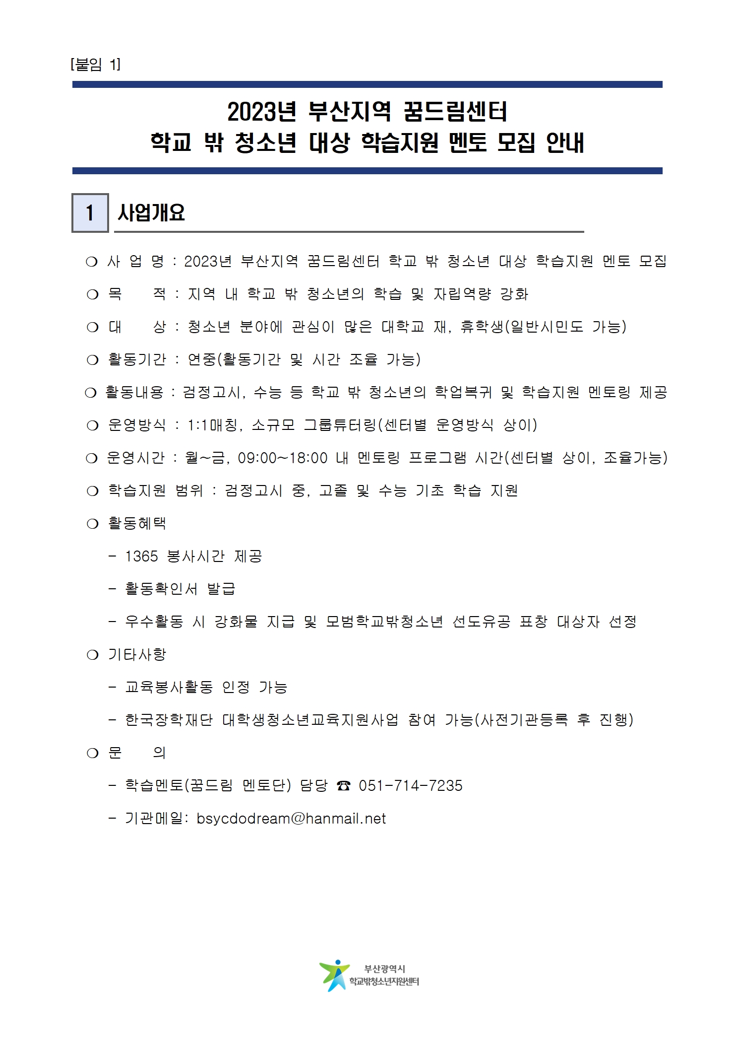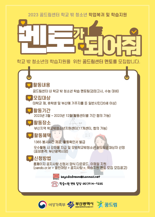 [부산광역시청소년상담복지센터] 2023년 부산지역 꿈드림센터 학교 밖 청소년 대상 학습지원 멘토 모집 안내