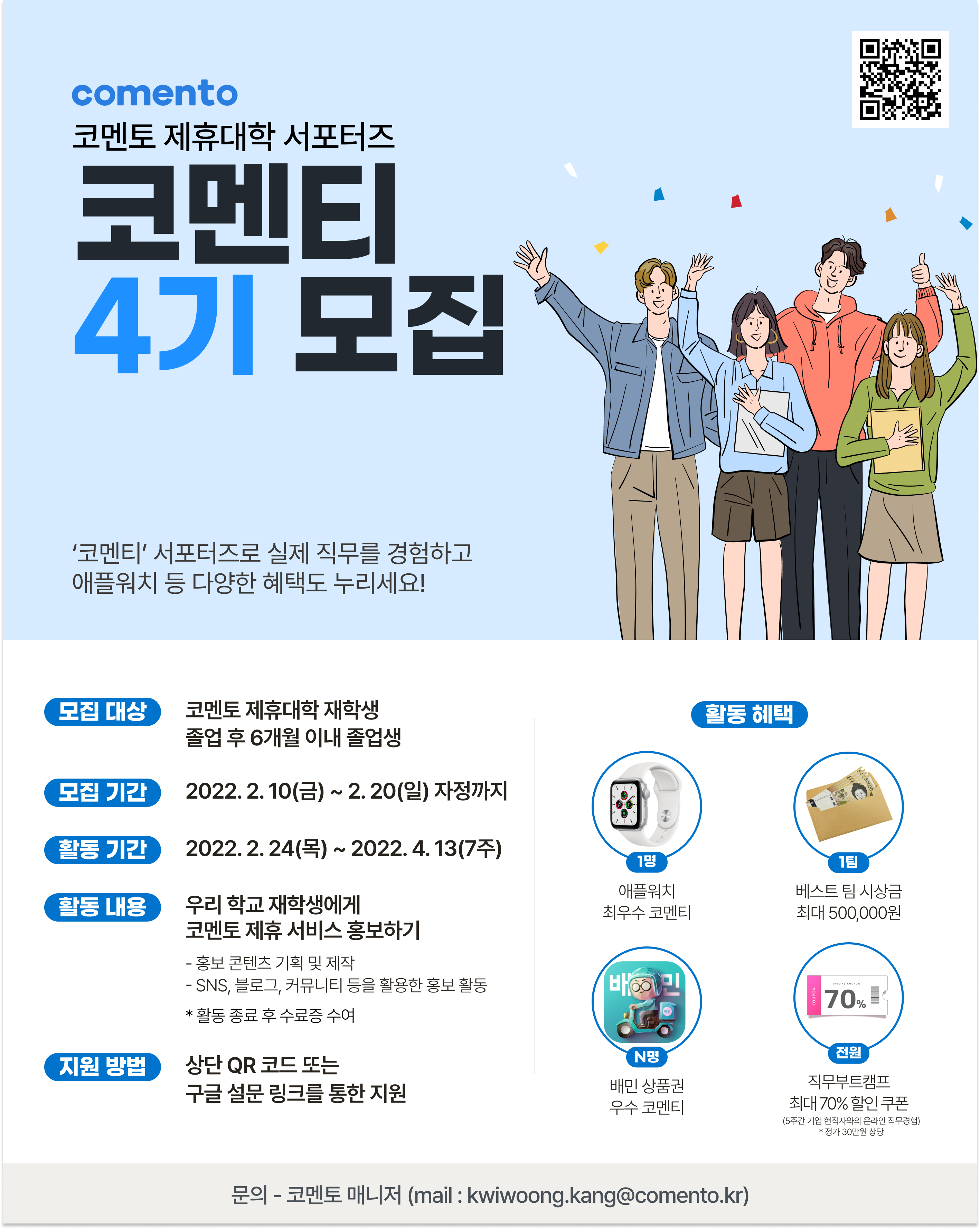 짧은 기간 활동하고 찐~한 대외활동 경력 쌓고 싶으신 분컨텐츠 제작이나 홍보 마케팅에 관심있으신 분이벤트를 직접 기획하고 성과를 확인하는 경험을 해보고 싶으신 분주변에 좋은 영향을 끼치고 싶은 오지랖퍼들