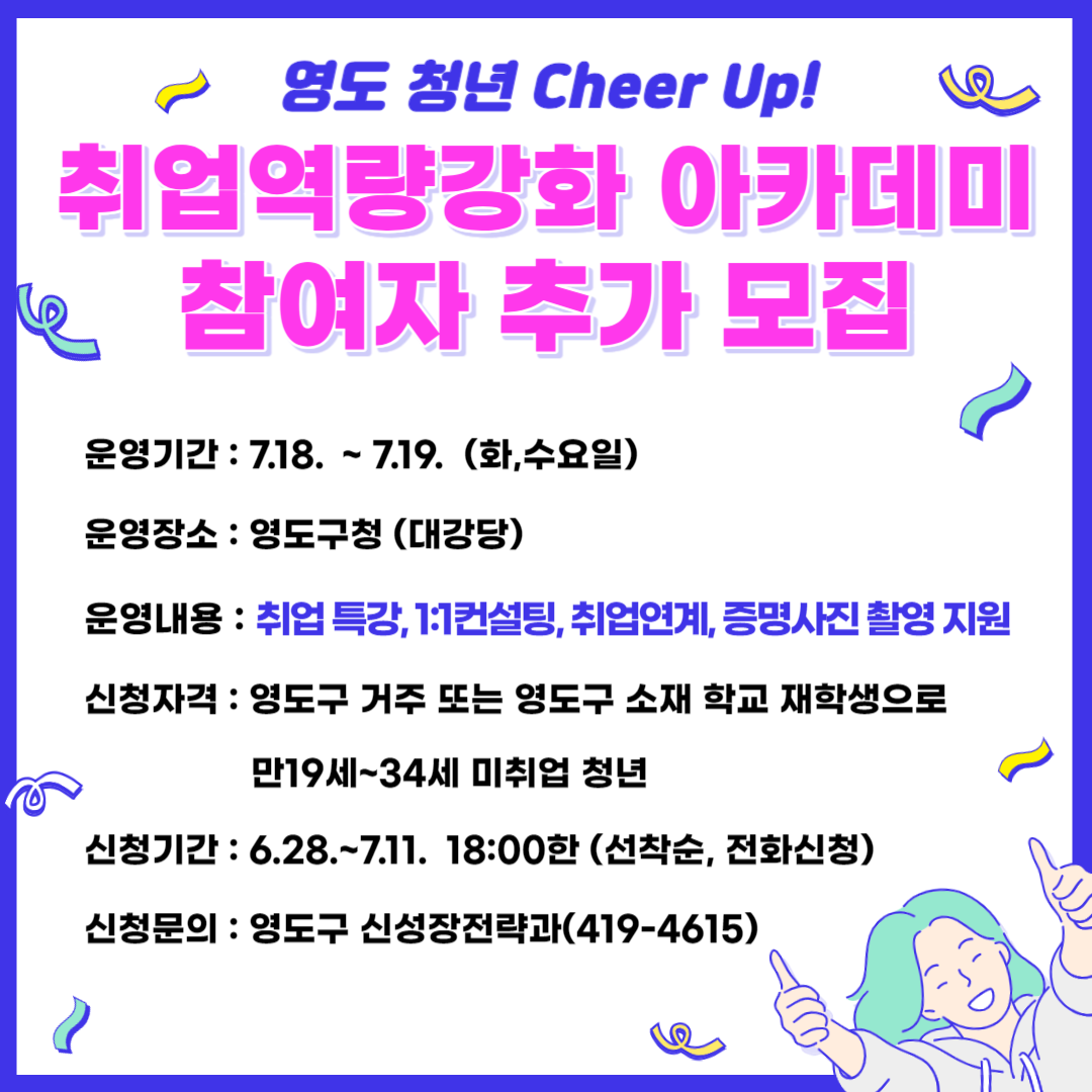 ■ 사업 개요 ○ 사 업 명: 영도 청년 Cheer Up! 취업 역량강화 아카데미(추가 모집) ○ 교육 기간 : 2023. 7. 18. ~ 7. 19. (화·수요일) ○ 교육 장소 : 영도구청(대강당) ○ 교육 대상 : 영도구 거주 또는 영도구 소재 학교 재학 만19세~34세 미취업 청년 ○ 교육 내용 : 취업 특강, 1:1 컨설팅, 증명사진 촬영, 취업연계 등 ■ 모집 개요 ○ 추가 모집 인원 : 12명 ○ 신청 자격 : 영도구 거주 또는 영도구 소재 학교 재학 만19세~34세 미취업 청년 ○ 신청 기간: 2023. 6. 28.(수) ~ 7. 11.(화) 18:00한 ○ 신청 문의 : 영도구 신성장전략과 ☎ 051-419-4615 (선착순 전화 접수) |