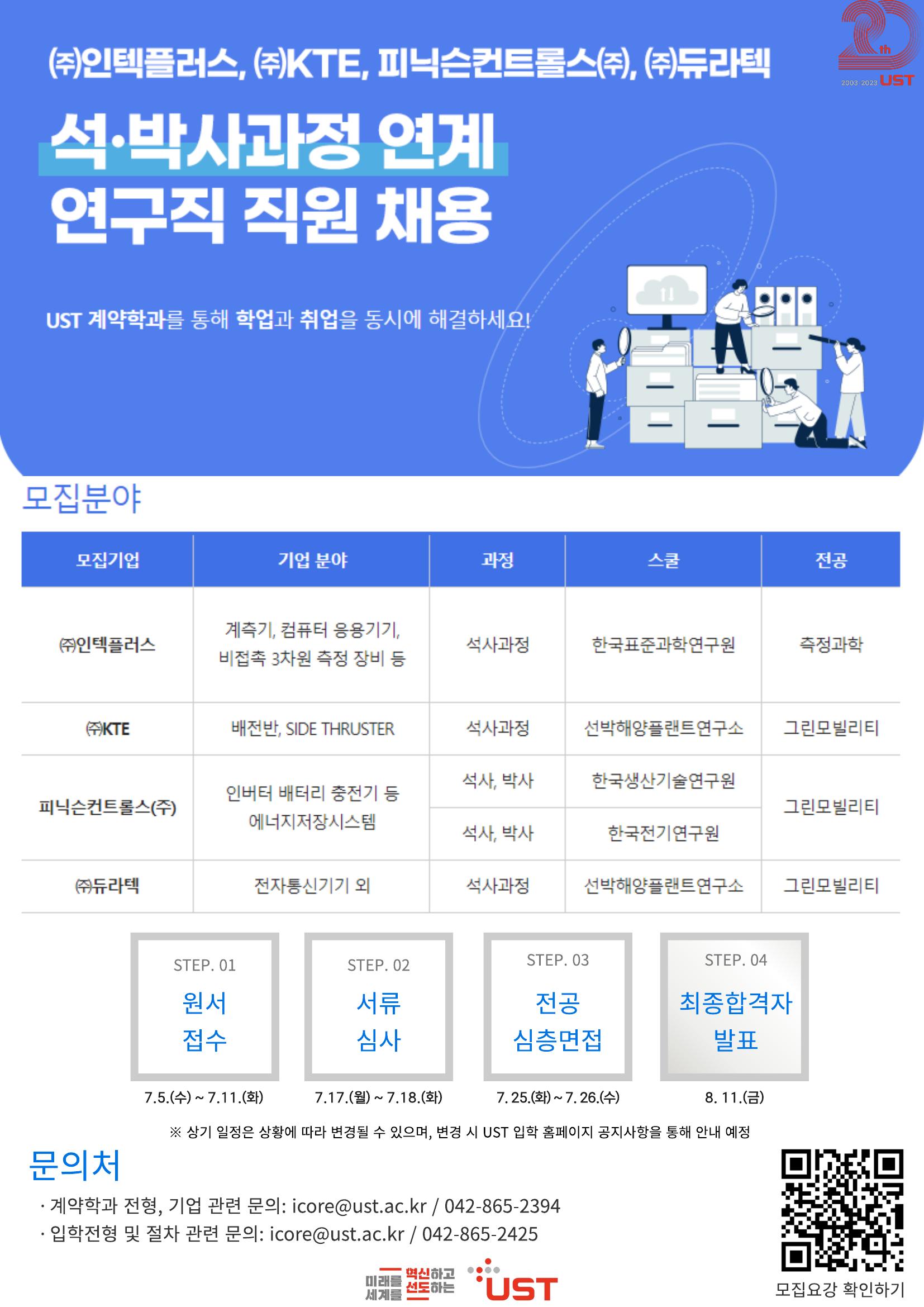 과학기술정보통신부 산하 UST(과학기술연합대학원대학교)에서는 과학기술분야 정부출연연구원과 함께 중견·중소기업 고급인재 양성을 지원하기 위한 채용조건형 계약학과를 운영하고 있습니다. 아래의 협약기업에서 귀교의 우수한 인재를 대상으로 홍보를 희망하여 붙임과 같이 추천 요청서를 송부 드리오니 많은 관심 부탁드립니다.