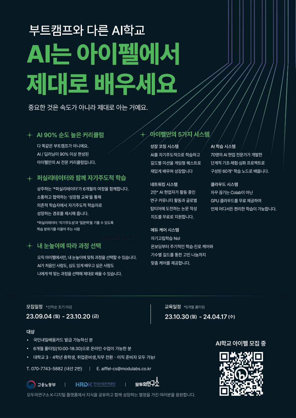 모두의연구소는 고용노동부와 K-디지털 트레이닝 사업 운영기관으로 AI 전문 인재를 육성하는 'AI학교 아이펠' 교육 운영 기관입니다. 이에 따라 국민내일배움카드 발급 가능자 혹은 AI분야로 취업을 희망하는 청년들이 1,500만 원 상당의 AI교육을 무료로 학습할 수 있는 기회가 주어질 수 도록 홍보 협조를 부탁드립니다.