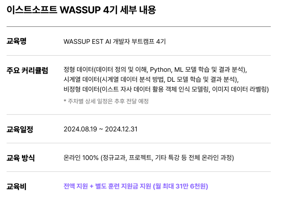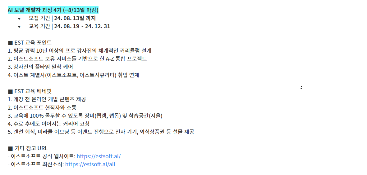 AI 모델 개발자 양성과정 : [ESTsoft] WASSUP EST AI모델 개발자 양성 과정 4기 모집 (※마감 임박) (greetinghr.com)