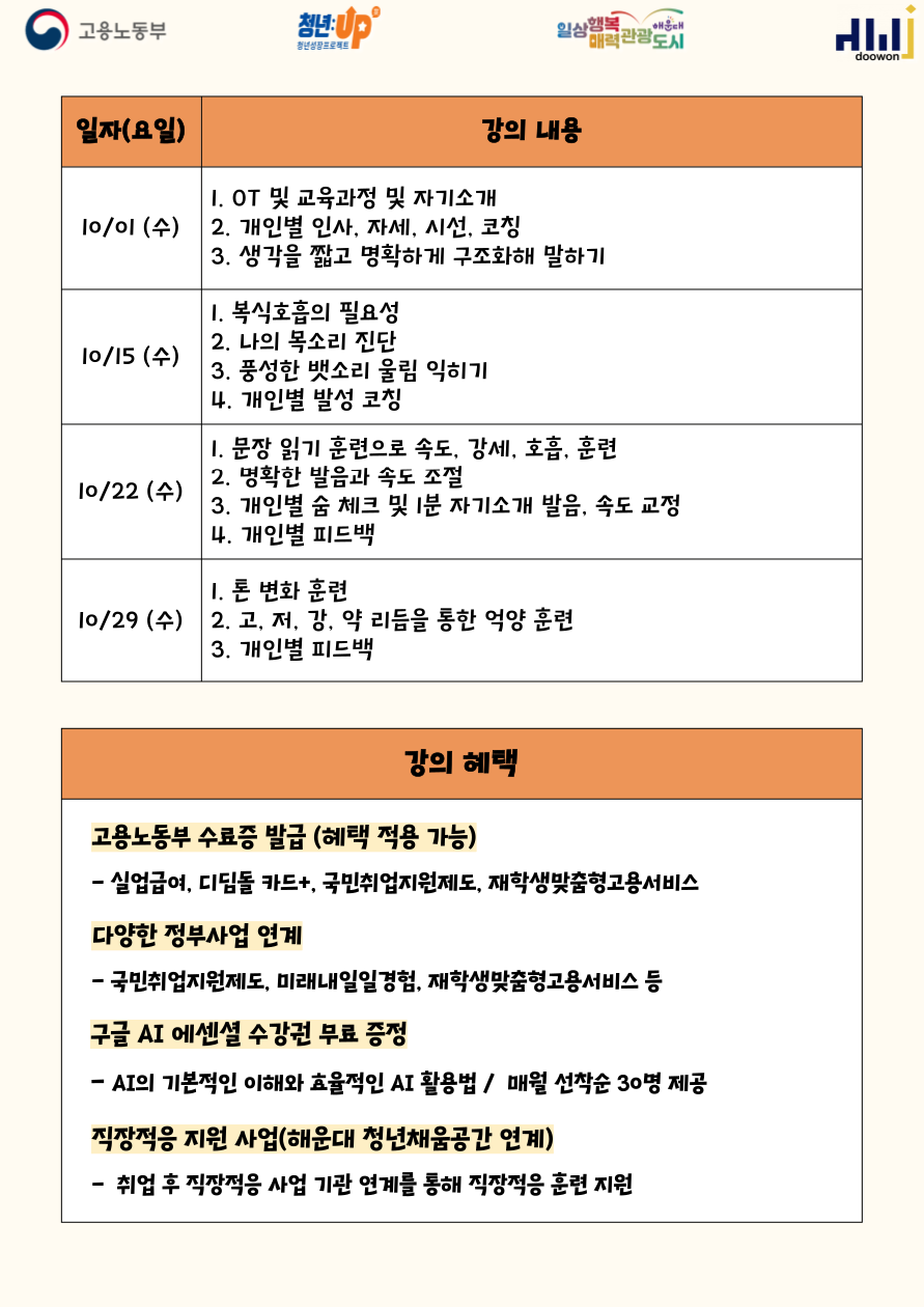 10.01, 10.15, 10.22, 10.29 (매주 수요일) : 취업면접 스피치 교육