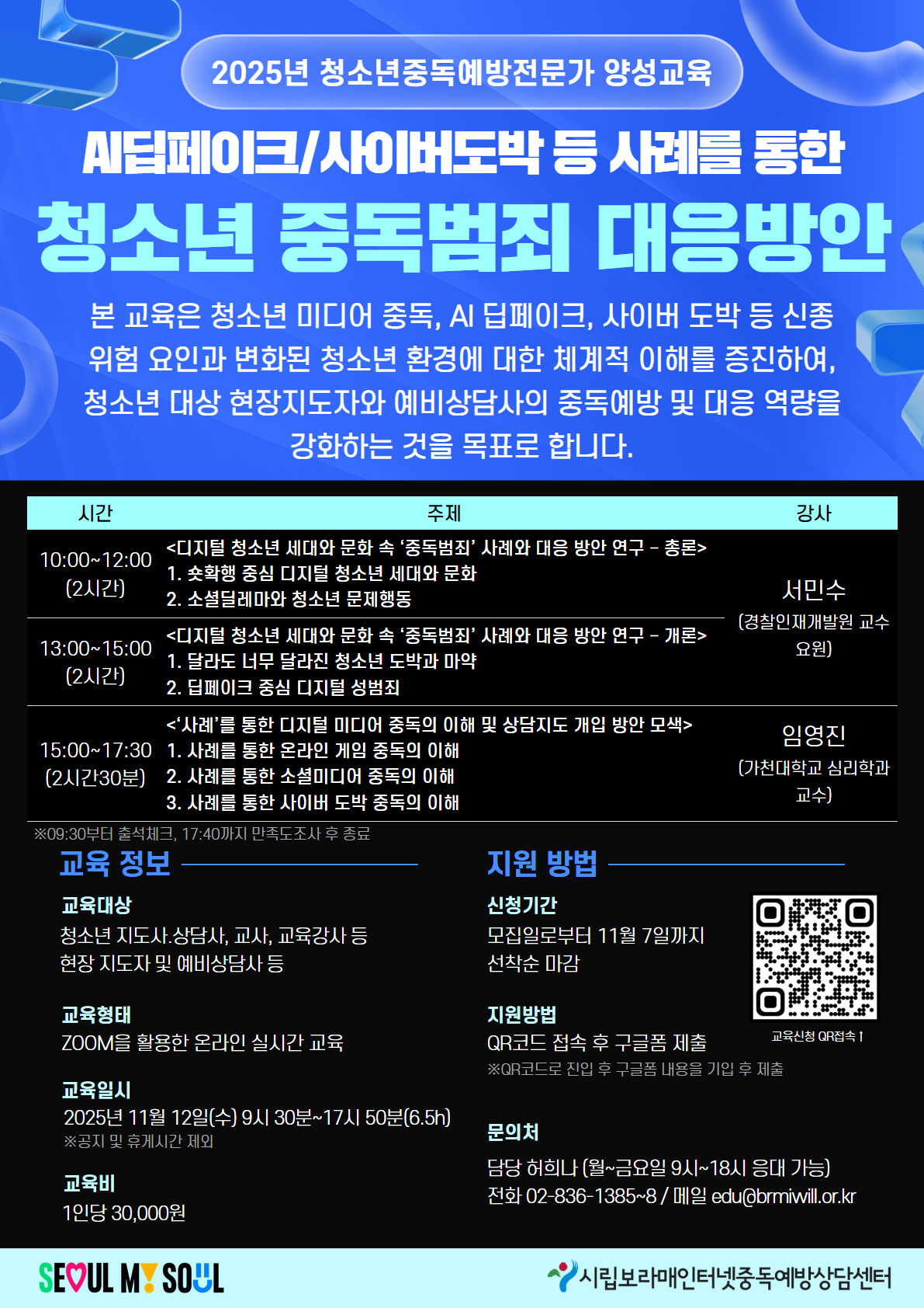 [시립보라매인터넷중독예방상담센터] (선착순 마감/수료증 발급) 2025년 청소년중독예방전문가 양성교육 <청소년 AI딥페이크·사이버도박 등 중독범죄 대응>