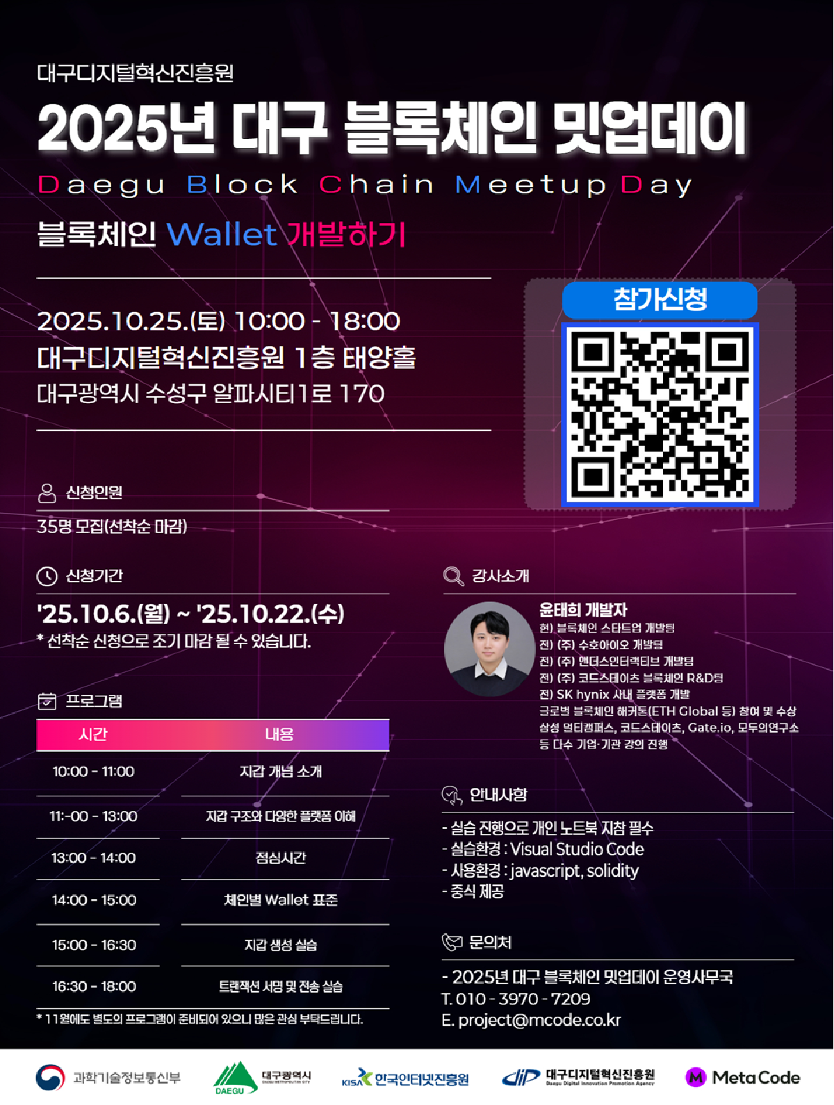 [무료/선착순] 하루 만에 배우는 블록체인 Wallet 개발하기안녕하세요. 메타코드입니다.과학기술정보통신부와 한국인터넷진흥원이 주관하고, 대구광역시와 대구디지털혁신진흥원이 함께하는 「2025년 대구 블록체인 밋업데이」에 여러분을 초대합니다.이번 과정은 "블록체인 Wallet 개발히기"를 주제로, 실습 중심으로 진행됩니다.• 교육 개요- 주제: 블록체인 Wallet 개발하기- 일시: 2025년 10월 25일(토) 10:00 ~ 18:00 - 장소: 대구디지털혁신진흥원 1층 태양홀 (대구광역시 수성구 알파시티1로 170)- 모집인원: 선착순 35명- 신청 기간: 2025년 10월 6일(월) ~ 10월 22일(수) • 강사 소개 윤태희 개발자 - 현) 블록체인 스타트업 개발팀 - 전) (주) 수호아이오 개발팀 - 전) (주) 앤더스인터랙티브 개발팀 - 전) (주) 코드스테이츠 블록체인 R&D팀 - 전) SK hynix 사내 플랫폼 개발 - 글로벌 블록체인 해커톤(ETH Global 등) 다수 참여 및 수상 - 삼성 멀티캠퍼스, 코드스테이츠, Gate.io, 모두의연구소 등 다수 기업·기관 강의 진행 • 실습 안내- 준비물: 개인 노트북- 실습환경: Visual Studio Code- 사용언어: Javascript, Solidity- 수료증 발급 + 중식 제공• 현장&동반 참여 이벤트 - 블록체인 교육 현장에 참여하고 만족도 조사를 완료하신 모든 분들께, 메타코드 강의(ADsP, SQLD, 중 선택)를 무료로 제공합니다. - [동반참여시 추가 지급] 개발/프로그래밍에서 활용 가능한 협업툴! 핵심만 배우는 Git & Github 활용의 모든것 강좌가 추가로 지급됩니다.- 동반참여자 확인은 현장에서 진행됩니다.• 신청 방법- https://forms.gle/MCVuREWcuCn6itUm9- 문의: 010-3970-7209