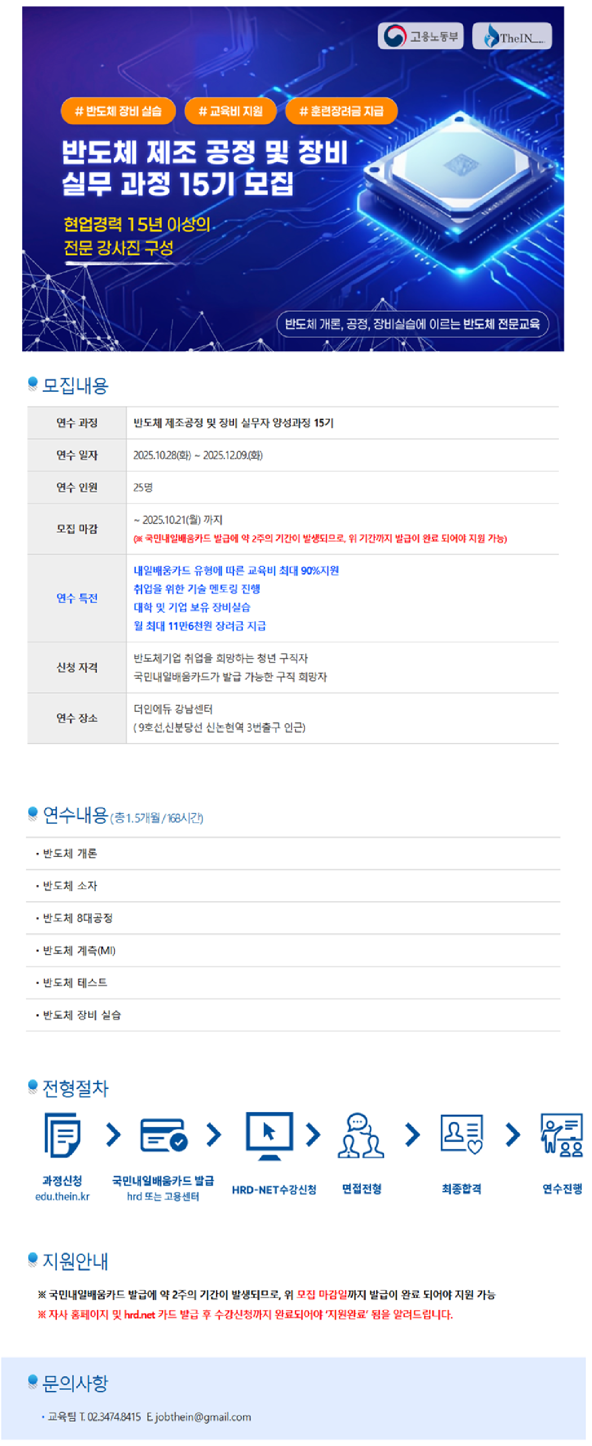 - 모집기간 : 2025년 10월21일(화) 까지 ( 조기종료될 수 있습니다. )- 연수과정 : 반도체 제조공정 및 장비실무자 양성과정 15기- 연수대상 : 반도체기업 취업을 희망하는 청년구직자 *국민내일배움카드 발급 가능한 구직희망자 ( 고용노동부에서 자격 및 방법 확인가능 )