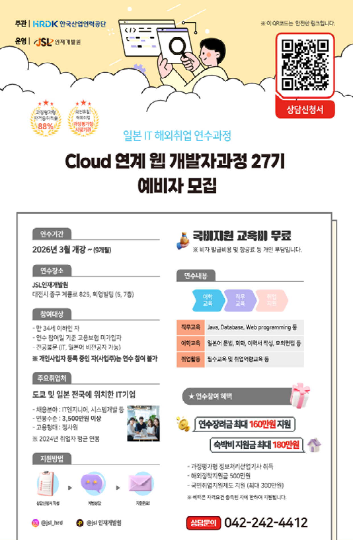 ☞ 참가혜택 : 연수비 전액 무료, 과정평가형 정보처리 산업기사 자격증 취득, 일본 IT기업 취업 연계, 숙박비 지원금, 연수 장려금 등