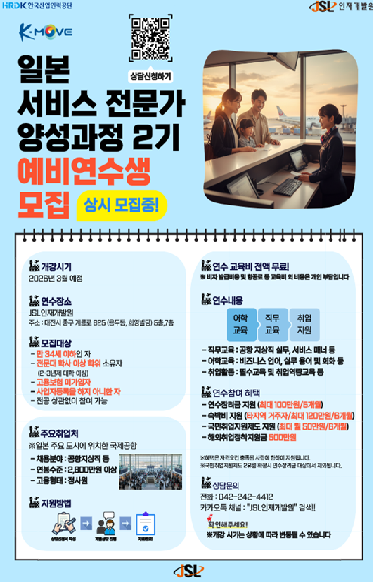 ☞ 참가혜택 : 연수비 전액 무료, 일본 공항서비스 기업 취업 연계, 숙박비 지원금,연수 장려금 등