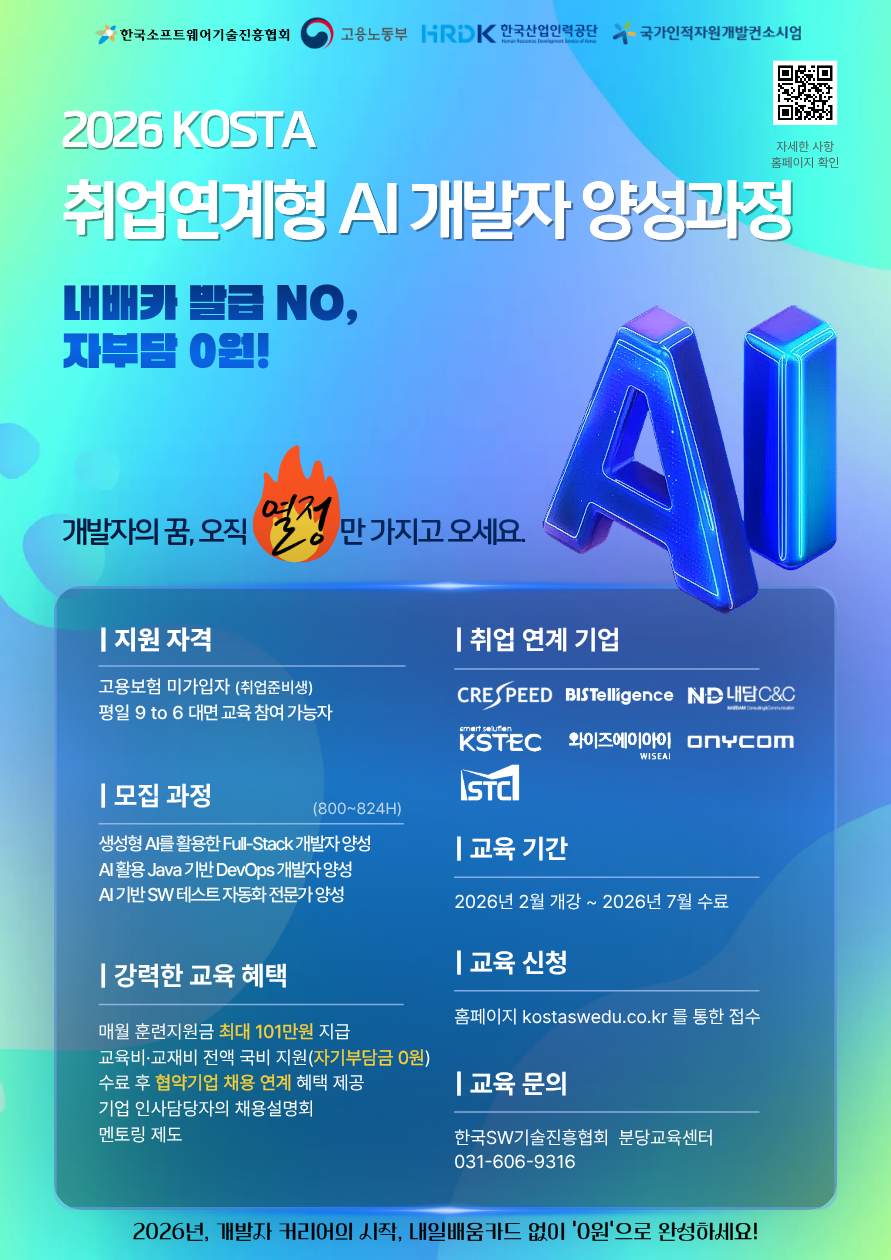 현재 한국소프트웨어기술진흥협회에서 2026년도 상반기 훈련생 모집을 진행하고 있습니다.