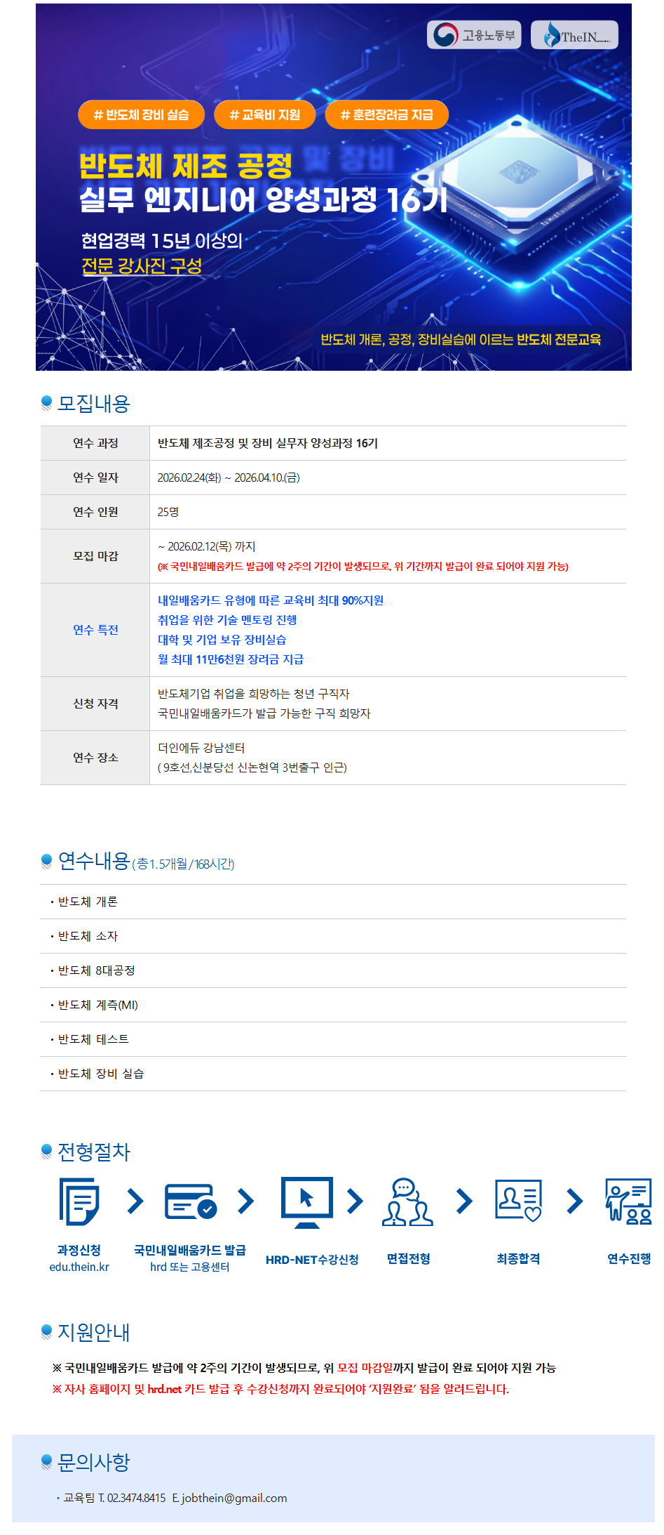 - 모집기간 : 2026년 2월12일(목) 까지 ( 조기종료될 수 있습니다. )- 연수과정 : 반도체 제조공정 및 장비실무자 양성과정 16기- 연수대상 : 반도체기업 취업을 희망하는 청년구직자 *국민내일배움카드 발급 가능한 구직희망자 ( 고용노동부에서 자격 및 방법 확인가능 )