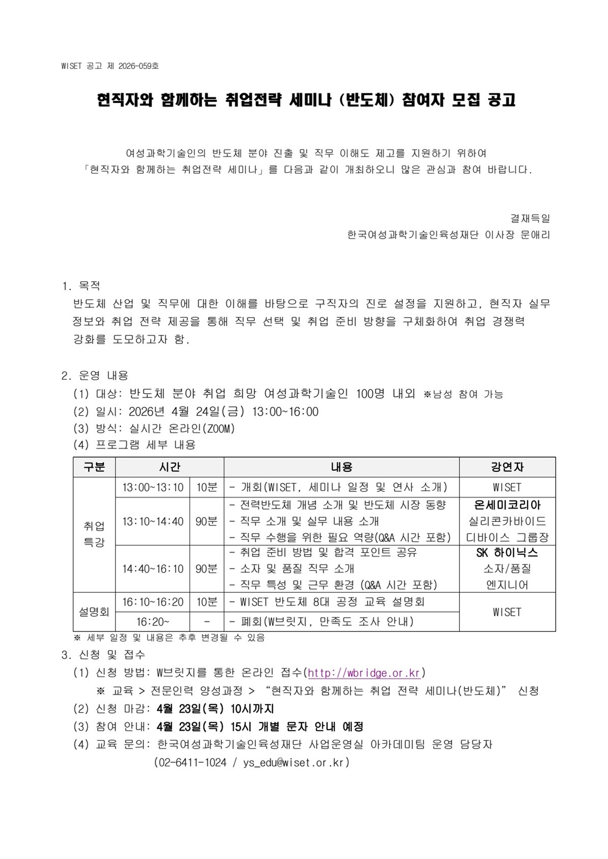 가. 교육개요 1) 교육명 : 2026년 현직자와 함께하는 취업 전략 세미나(반도체) 2) 교육대상: 반도체 분야 취업을 희망하는 미취업자 3) 신청기간 : ~ 2026년 4월 23일 (목) 10:00 까지 4) 교육일시 : 2026년 4월 24일 (금) 13:00~16:00 (3h) 5) 참여방법 : 실시간 온라인(ZOOM)나. 교육내용: 아래공고 참고다. 교육신청 : W브릿지(www.wbridge.or.kr) > 교육 > 전문인력 양성교육 에서 신청라. 요청사항 교육생 모집을 위한 홈페이지 공지 혹은 게시판 게재, 학생 및 회원 대상 안내 메일 발송 등마. 관련문의 : 한국여성과학기술인육성재단 아카데미팀 02-6411-1024 ,ys_edu@wiset.or.kr