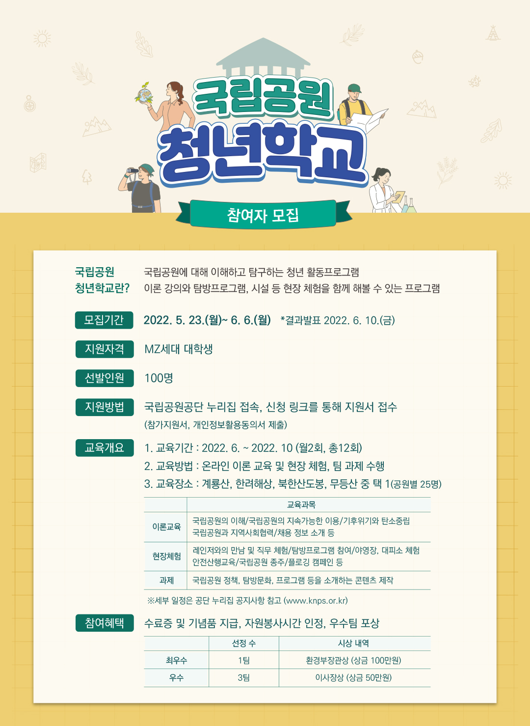 국립공원공단에서는 청년층을 대상으로 다양한 탐방프로그램 등 국립공원 체험 기회를 제공함으로써 국립공원에 대한 이해도를 높이고 공단 취업에 도움을 주고자 「국립공원 청년학교」를 아래와 같이 운영하오니 관심있는 청년들의 많은 참여 바랍니다.