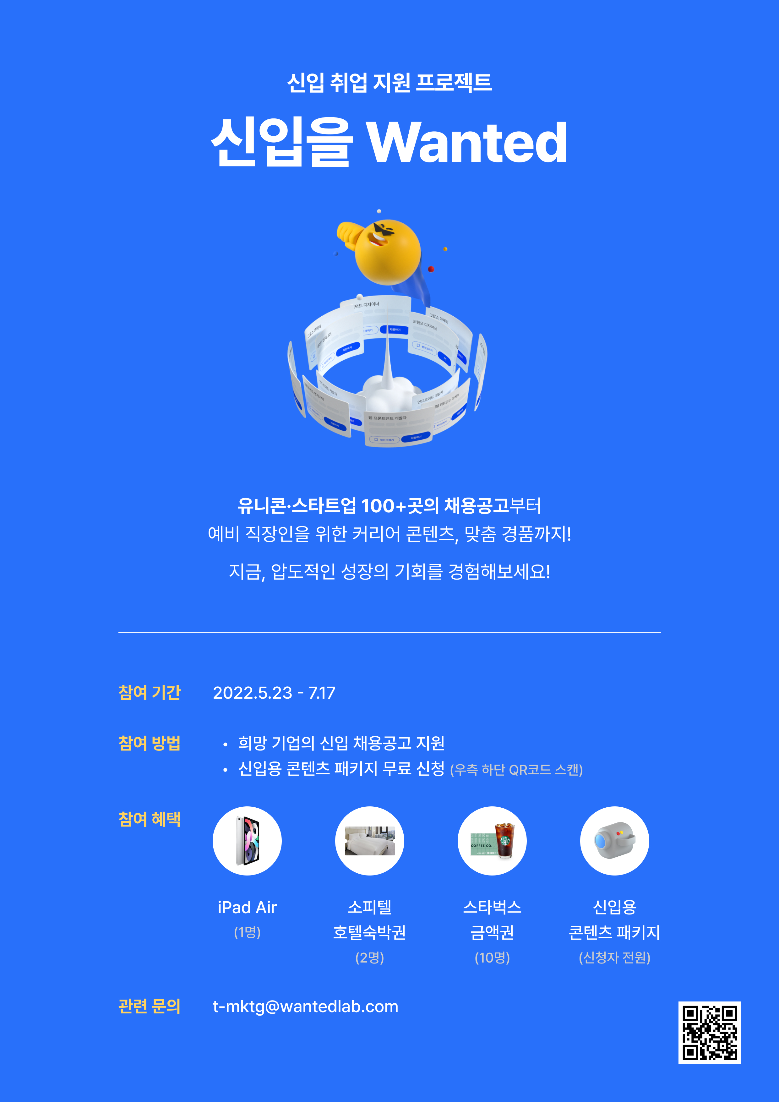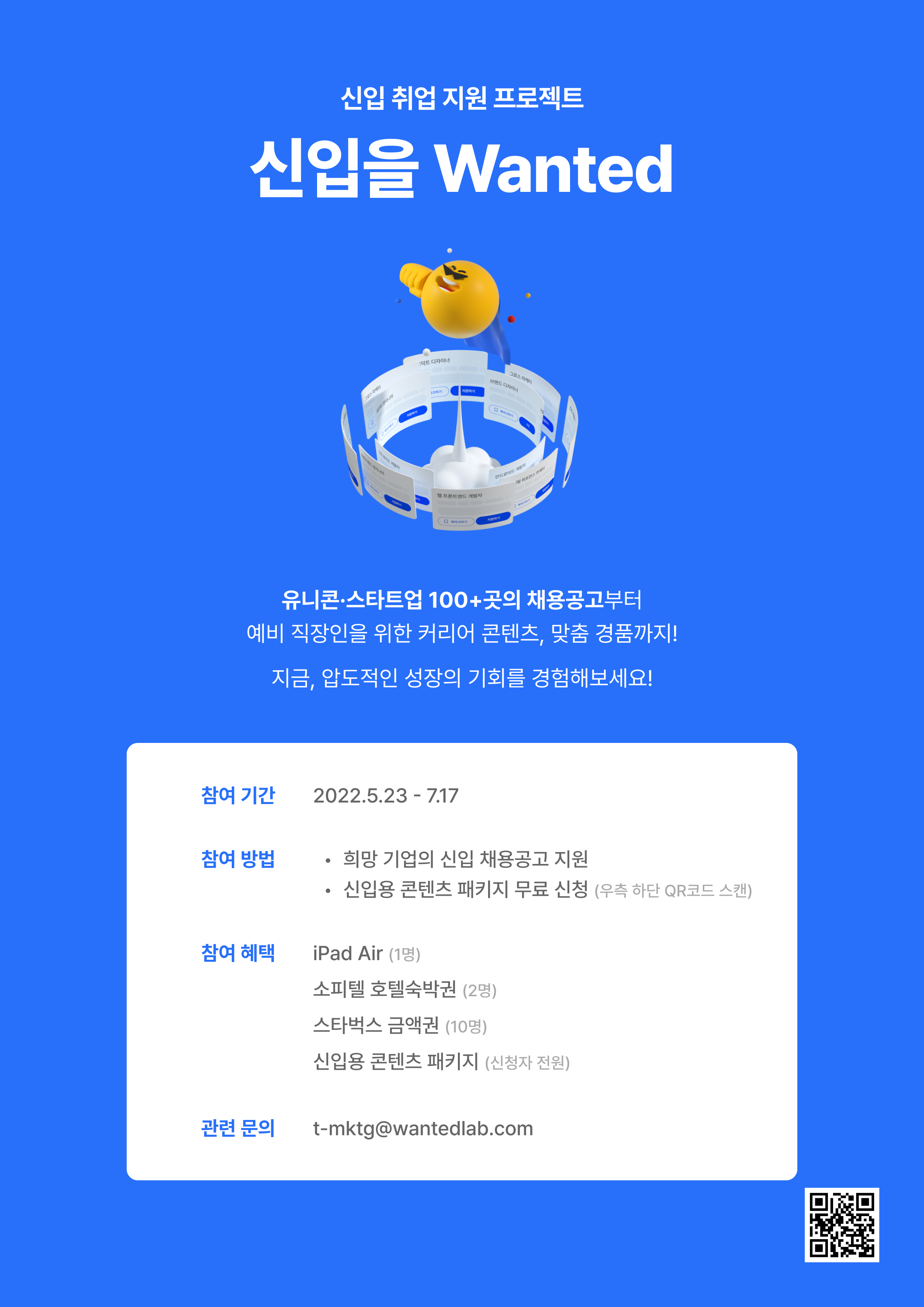 [신입 취업지원 프로젝트: 신입을 Wanted]즉시 지원할 수 있는 유니콘/스타트업 100+곳의 채용공고부터인사이트 가득한 신입용 콘텐츠 패키지, 맞춤 경품까지!초년생 커리어의 시작,취업부터 성장까지 원티드에서 경험하세요!*대상: 신입 및 주니어 직장인(0~2년차, 취준생 포함)*참여: 희망 기업의 신입 채용공고 지원 & 신입용 콘텐츠 패키지 무료 신청*혜택: 신입용 콘텐츠 패키지(신청자 전원), iPad Air(1명), 스타벅스 금액권(10명) 등*일정: 5.23(월) ~ 7.17(일)=> 자세히 보기: https://bit.ly/3yU5rZr