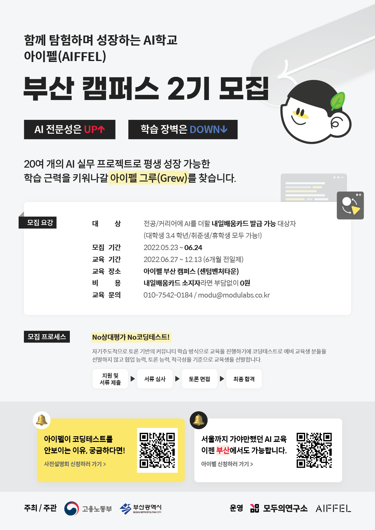 1)참여기관:(주관부처)고용노동부(주최)부산광역시(훈련기관)㈜모두의연구소