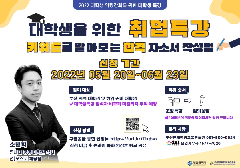 라. 대 상: 부산 지역 대학생 ▷ 특강 참석자에게 비교과 마일리지 부여 예정