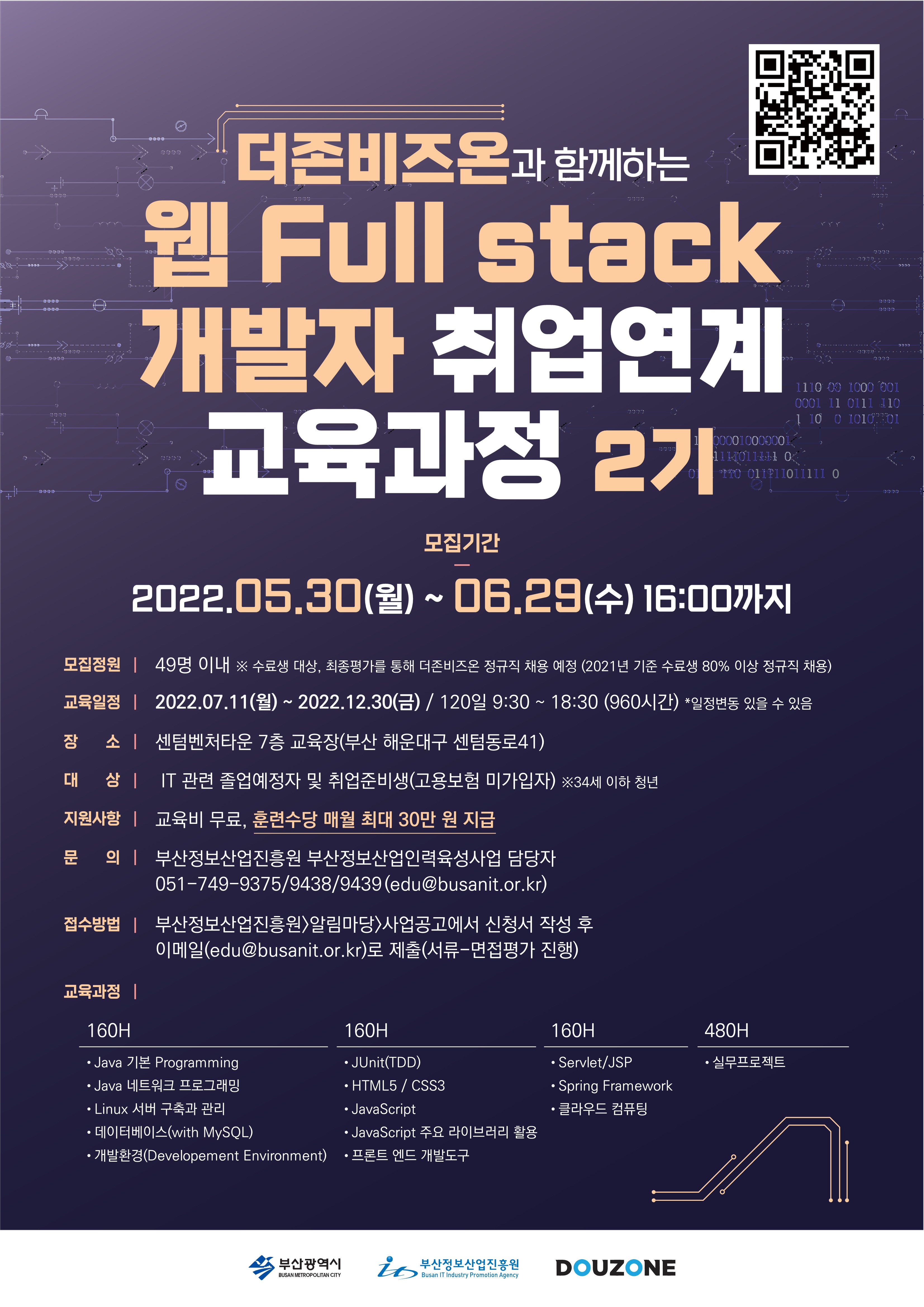 ㅇ과 정 명 : 웹 Full Stack 개발자 양성과정 2기ㅇ주요내용 : 교육 종료 후 우수 교육생 더존비즈온 정규직 채용 예정(2021년 기준 수료생 80% 이상 정규직 채용)ㅇ모집기간 : 22.5.30(월)~6.29(수) 16:00까지ㅇ교육기간 : 22.7.11(월)~12.30(금)ㅇ지원내용 : 교육비 무료, 훈련수당 월 최대 30만원 지급, 교육 인프라 지원 등