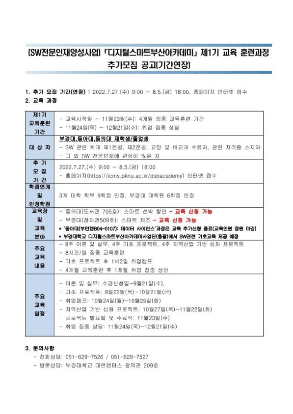 [디지털스마트부산아카데미] 1기 교육과정의 교육생을 8월5일(금)까지 추가모집하오니, 관심있는 재학생 및 졸업생 분들의 많은 지원 바랍니다.