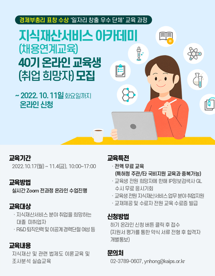IP(지식재산)서비스 아카데미 40기 채용연계 온라인 교육생 모집(~10/11)