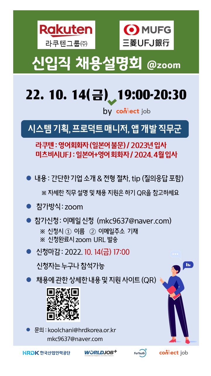 - 현재 라쿠텐, 미츠비시은행의 대기업 채용이벤트 Connect Job 2023을 한국산업인력공단과 협업중에 있습니다. (하단 URL 참고요망)