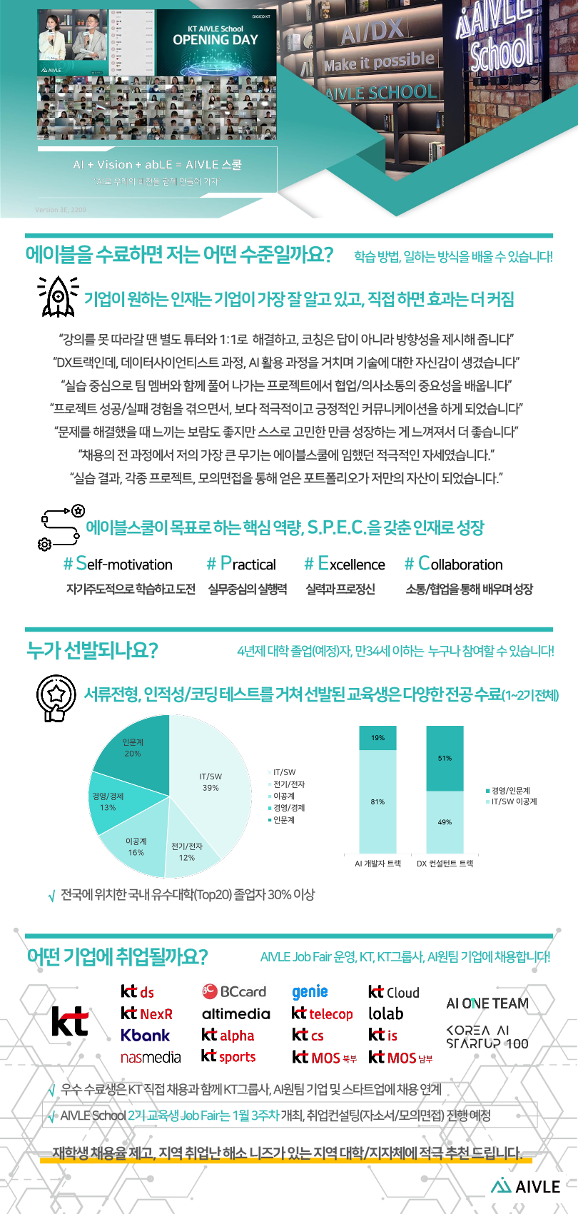- 1기생수료 및 취업 : 지원자 90명, 입교 55명, 수료 34명, KT그룹사 취업 16명(KT본사 9명포함), 지역별 인재 선발