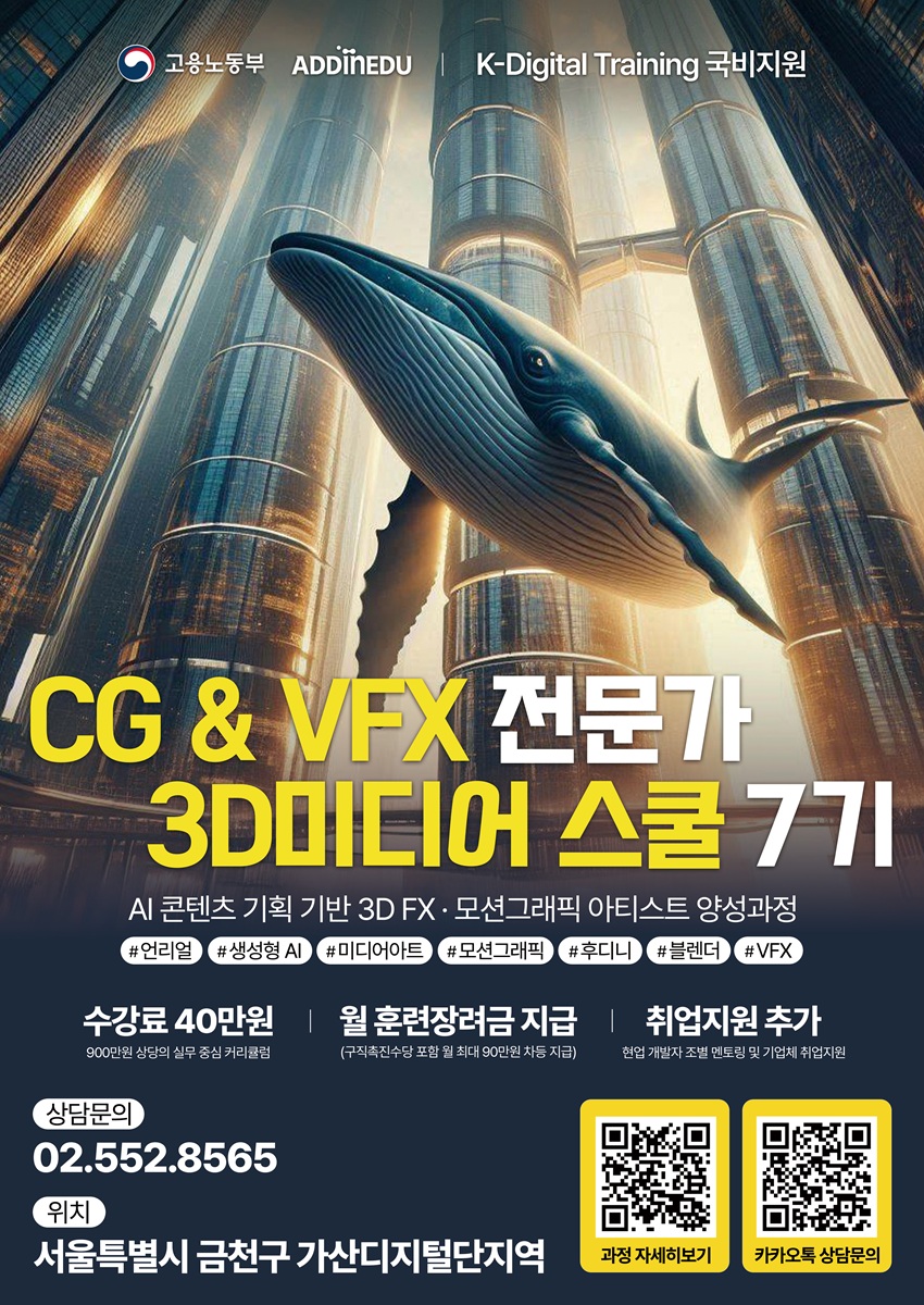 교육내용:· AI를 활용한 콘텐츠 기획 및 시각화· 모션그래픽 및 VFX 제작 이론·실습· 프로젝트 기반 영상 콘텐츠 제작· 개인·팀 단위 포트폴리오 완성
